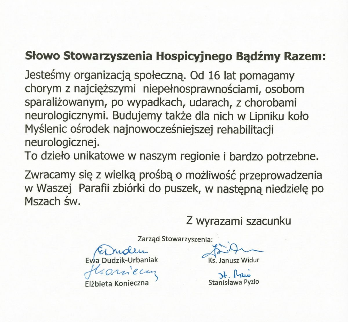 W niedzielę przyszłą składając ofiary do puszek, pomożemy chorym z Hospicjum „Bądźmy Razem”.